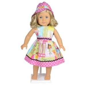Product Description : Here is an adorable doll dress that fits 18" dolls and the American Girl Doll. This adorable dress will have heads turning. Sleeveless sugar plum fabric with pink and white polka dot trim and black ric rac will give your sweet doll a great summer look. Matching hat included. velcro back.
